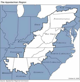 This area is the Appalachian mountains, stretching from Alabama in the south to New York in the north.