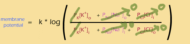 By the way, the value of k = 62 mV comes from the calculation of 2.303 x RT/ZF, where 2.303 is the conversion from log base e to log base 10, R is the constant from the gas equation, T is temperature in Kelvin (the absolute temperature), F is the Faraday constant and Z is the valence of the ion. Hence the value of 62 is valid only at body temperature (37 degrees Celsius).A deep sea fish would have a different value, because of the lower effect of temperature on the potential energy of the ions!
