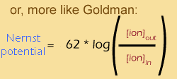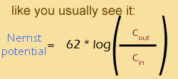 Here is an even simpler way of stating the same thing, called the "Nernst Equation", and as an added bonus I'll even let you in on the value of the mysterious "k": at normal body temperature, 37°C, “k” is equal to 62 if you measure potential in millivolts AND if you use logarithms in base 10.