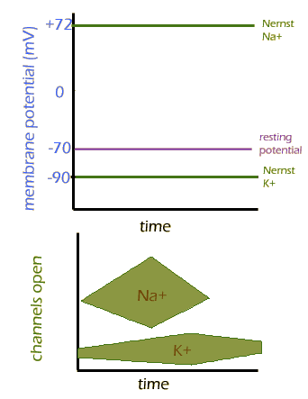 On the graph below, you see the Nernst potential for each ion, and the permeability of the two ions. Try to trace where you expect the membrane potential to be over time, before you mouse over the image: