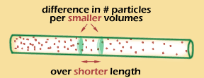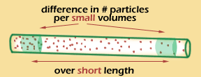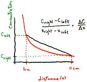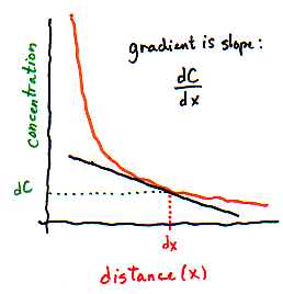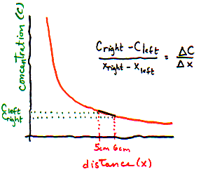 | We can't directly measure the concentration of particles in infinitely small slices!! But on the graph, we can interpret the gradient as the slope of the line -- which tells us how concentration changes when distance changes very slightly. | |