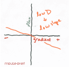 So what happens to flux if the diffusion coefficient changes? According to Fick's first law, these quantities are directly proportional to each other (remember the function is like y = mx) and -D is the slope. If you are interested in the diffusion of glucose instead of oxygen, you get a different diffusion coefficient D, and so the line has a different slope. In other words, when D is high, the same gradient causes more diffusion.
