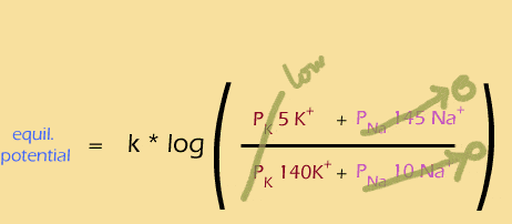 Notice that the actual number of ions inside and outside the cell have hardly changed AT ALL. All this de-, re-, and hyper-polarization will happen solely because the permeabilities are changing (i.e., channels are opening and closing). Relative to the number of ions already inside the cell it only takes a very, very small number of ions to enter or leave and change the membrane potential (look back at page 6 where we showed that a million ions a second is really a very small number).