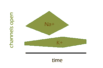 So let's look at the action potential in a little more detail. The first thing that happens is that the gated sodium channels open rapidly, while additional potassium channels also open, but much more slowly. The sodium channels quickly reach a peak and begin to close, while the additional potassium channels lag behind but eventually close as well. Here is one way to visualize that sequence of events: