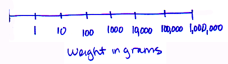 Our full data set lists the size and metabolic rate of 600 mammals that range in size from 2.5 grams (a shrew) to 325,000 grams (a moose). If we graph that on a normal scale, we might start with 0, then increase the scale in increments of 50,000 until we reach 350,000 (that would capture our entire shrew to moose range). Our axis would look like this: