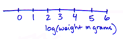 The above log-scaled axes still display the actual values of the weight. But log-scaled graphs are often portrayed with the values of the log labeled on the axis. For graphs with data displayed this way, just remember that each number represents the number of zeros after the "1" (when positive) or after the decimal point (if negative). Also, notice that the label specifies that the values are the log of the weight (rather than the weight itself).