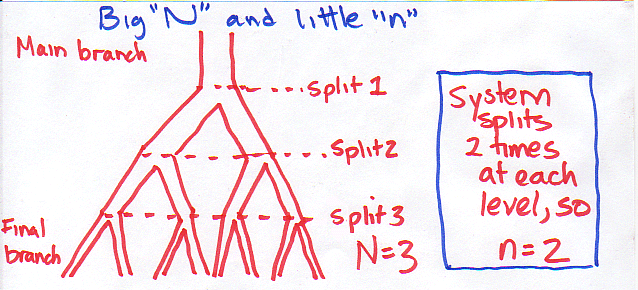 n = the number of times the network splits at each level (so each branch splits a consistent number of times (i.e., 2) as it moves down each level).