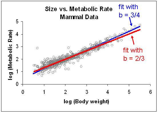 As you can see, these two lines are very close to each other. And statistical analysis of these kinds of data is very tricky - there is a lot of uncertainty in the parameter estimates - and recent publications in leading journals suggest that we can't really say whether the real scaling exponent is 2/3 or 3/4. But there are certainly many scientists convinced of the 3/4 scaling rule. Are they right or wrong? How can you tell?